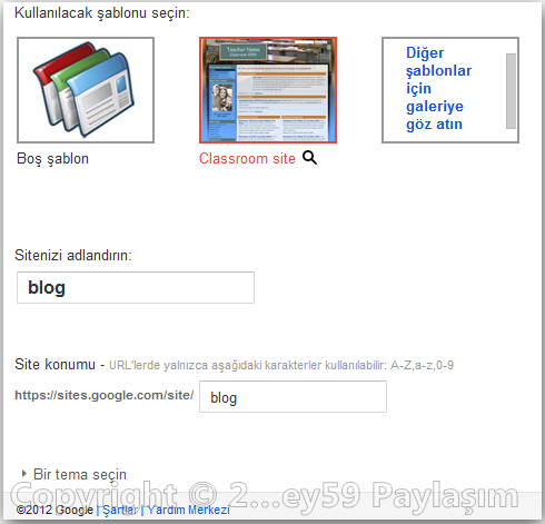Ve Karşımıza Oluştur diye bir kısım çıkacak tıklıyoruz. Açılan sayfada site adını belirliyoruz, temamızı seçiyoruz.Hatta galeriden önizleme yaparak istediğiniz bir şablonuda kullanabildiğiniz gibi kendinizde şekillendirebilirsiniz.